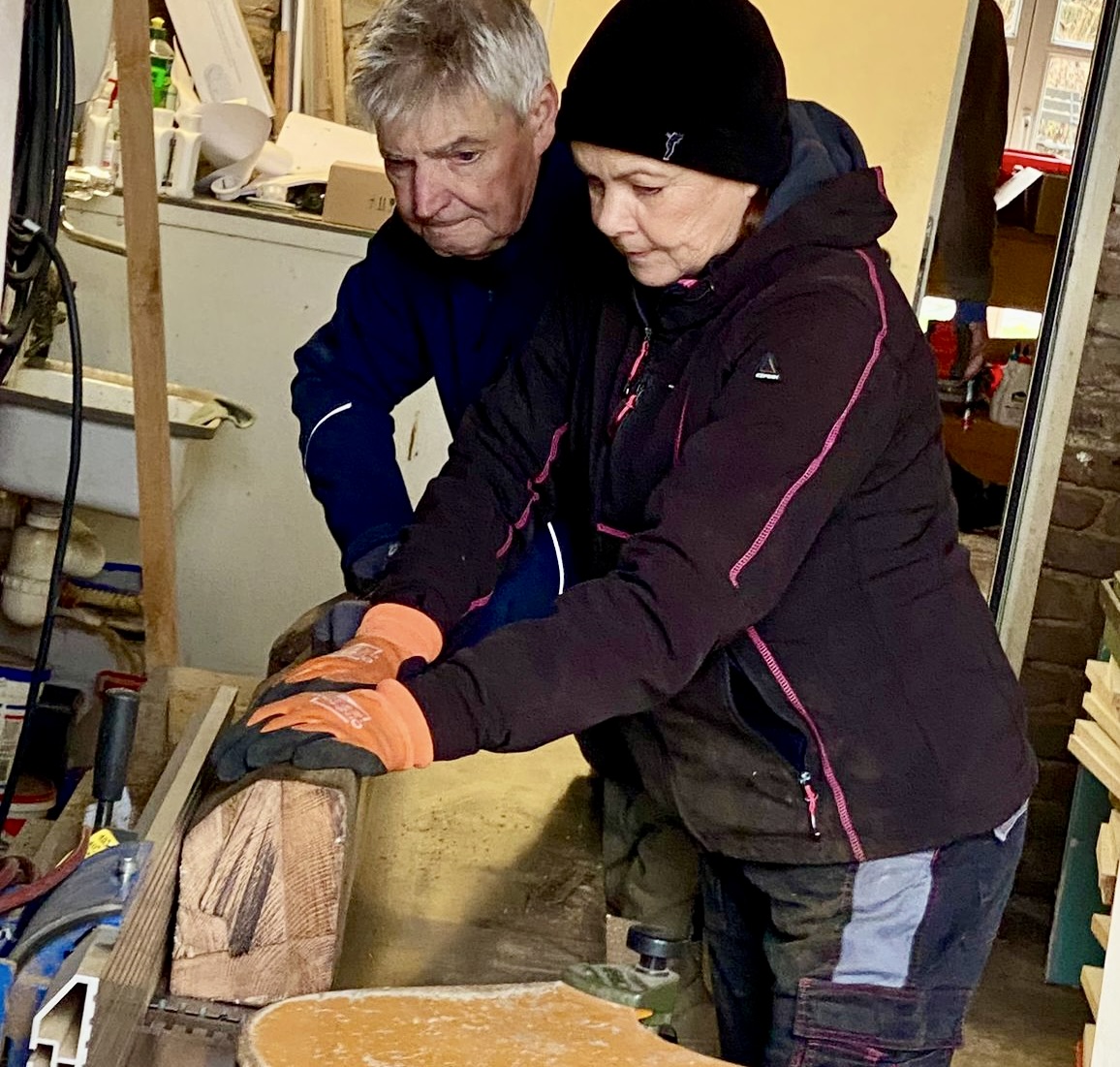 Für uns Lions, sonst eher Herren der Büros und Operationssäle, tut sich eine wunderbare Welt auf: Weg von den Fesseln im Beruf, hin zum Abenteuer, an die Säge, an die Fräse, an die Schleifmaschine, zum Maschinenhobel. Hin zu einer total anderen Beschäftigung. Mit Freunden, die noch bessere Freunde werden. Die handwerklich weniger Begabten kümmern sich um die Mittagssuppe, um Würstchen und den Hopfensaft. Auch einige unserer Damen legen Hand an und zeigen ihre handwerklichen Talente - in der Werkstatt ebenso wie an der Nähmaschine oder in der Schlussverarbeitung.
